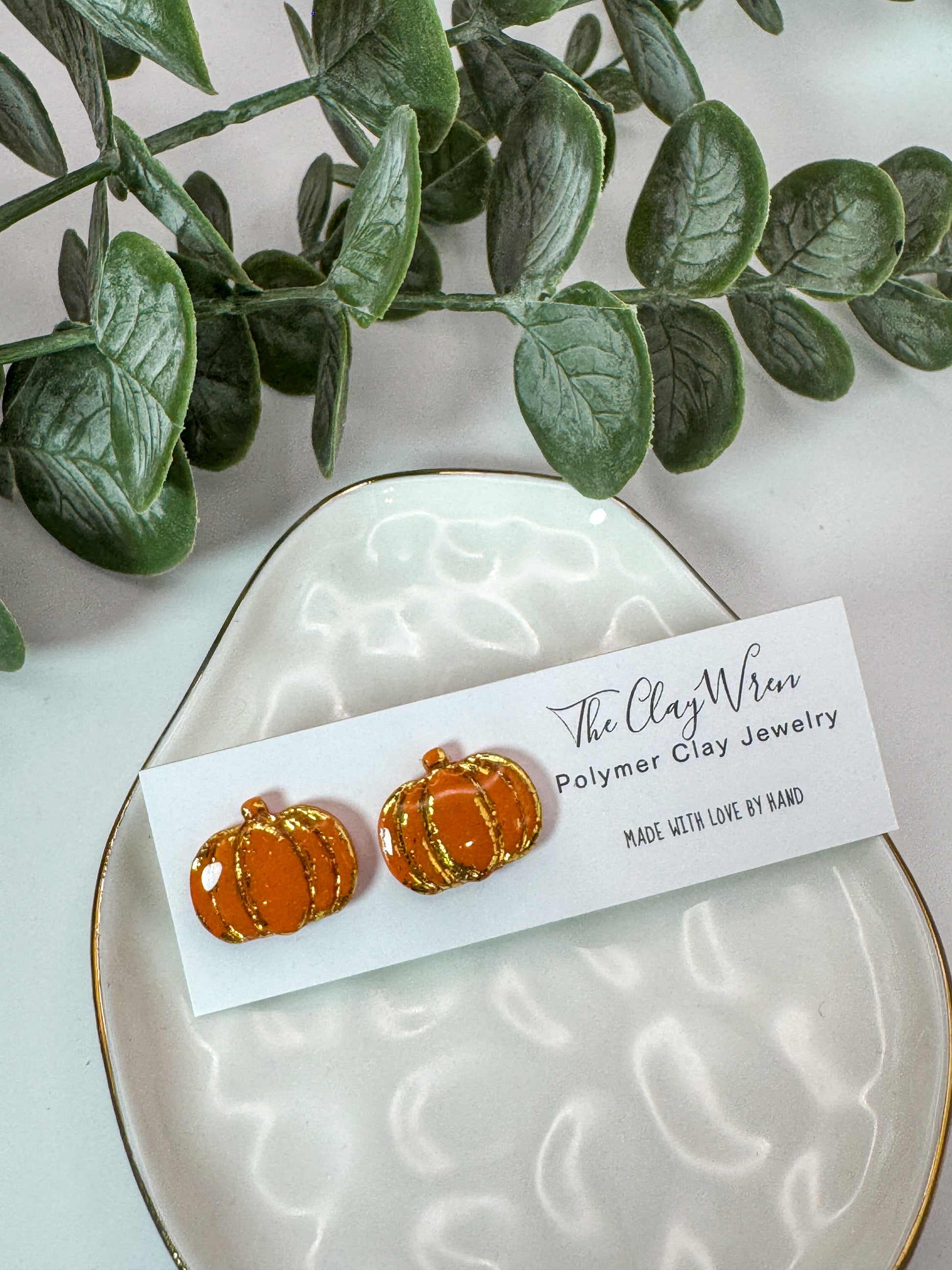 Orange pumpkins with gold foil accents. Materials: Polymer clay and stainless steel posts.